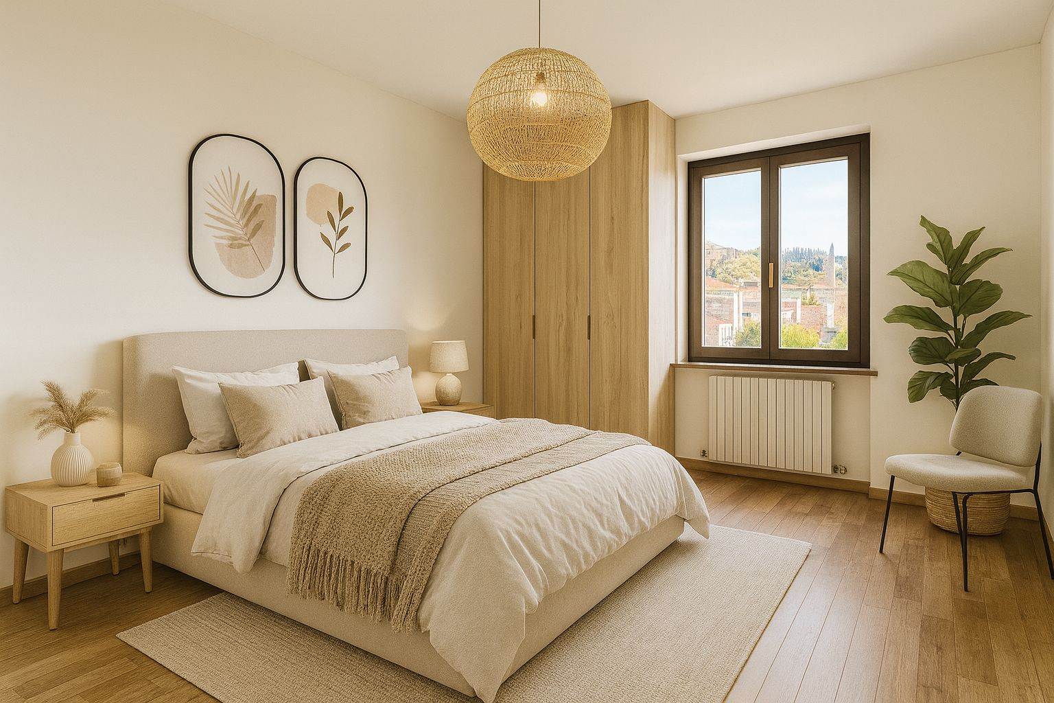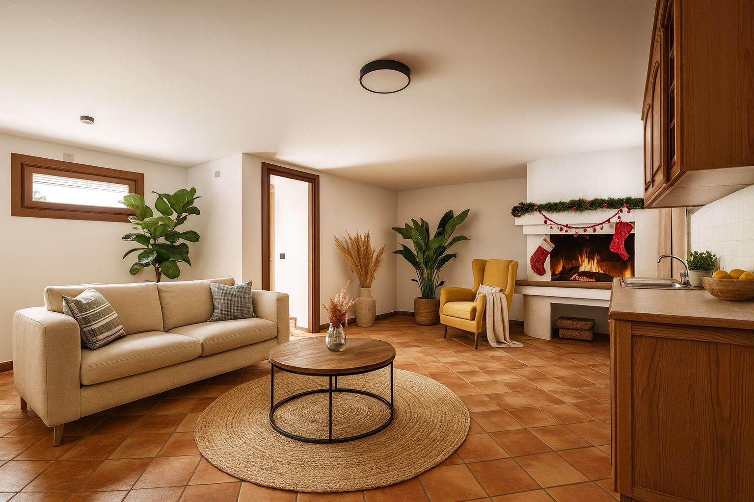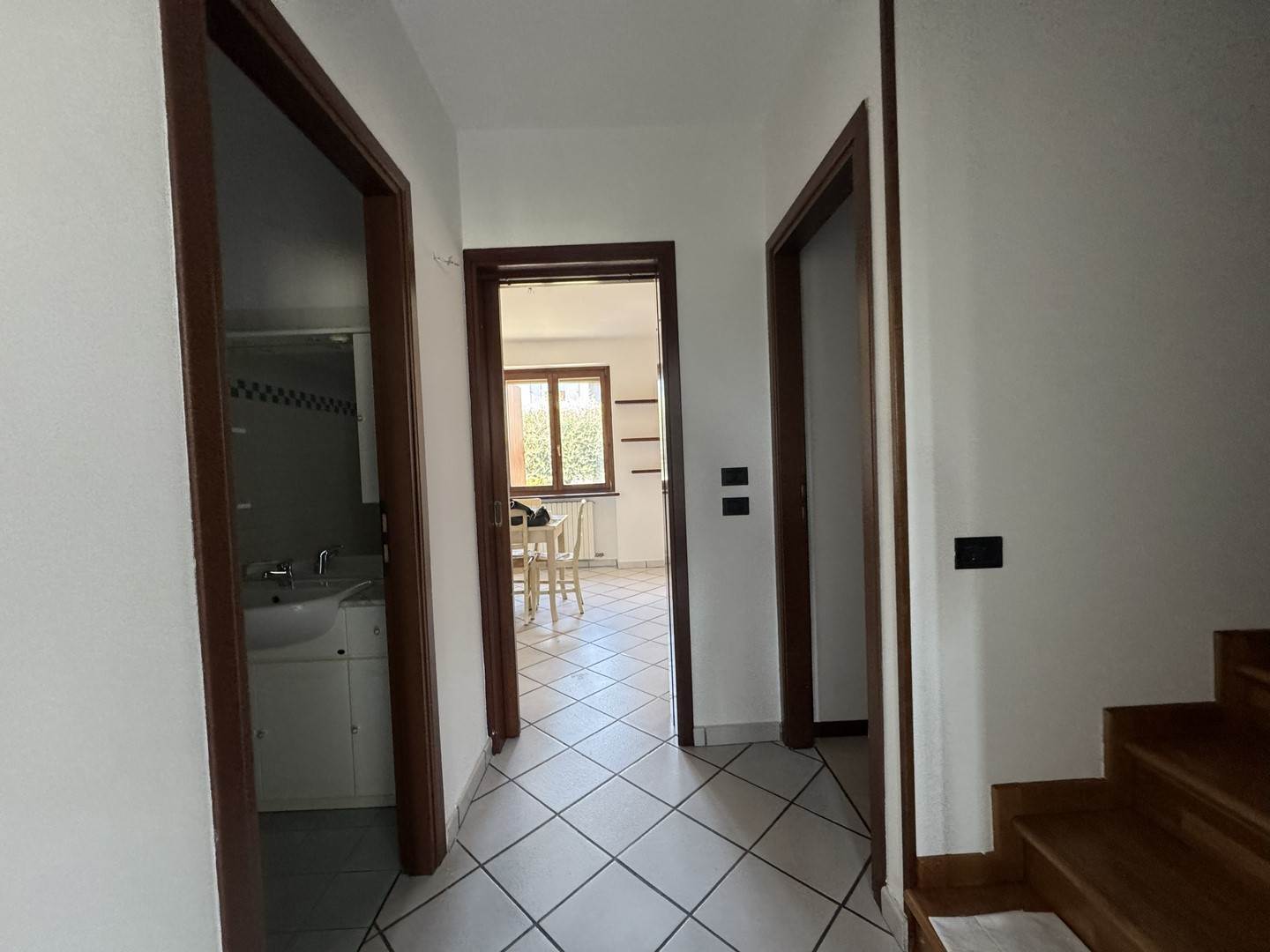 L’ingresso avviene tramite una corte esclusiva di circa 30 mq che conduce all’ampio e luminoso soggiorno. Sullo stesso piano si trovano una cucina separata con accesso al terrazzo e un comodo bagno di servizio.